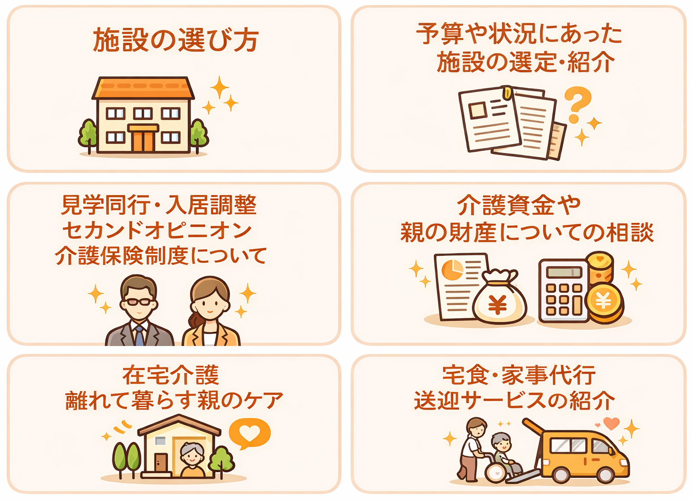 認定結果や症状、ご予算を整理した上で、今入れる可能性がある施設の選定や紹介、見学の日程調整や同行、入居までの流れについてもサポート。
