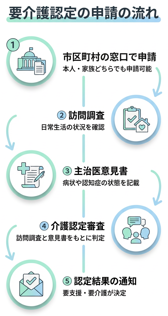 もしまだ申請されてない場合は、市区町村の窓口で要介護認定の申請を行ってください。その後訪問調査や主治医意見書を経て、介護度が決定されます。